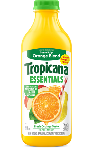 Tropicana’s delicious NEW OJ blend with no pulp! Tropicana Essentials is a blend of orange and other fruits that delivers fresh squeezed orange taste with everyday essential nutrition. With a good source of Antioxidant vitamins C & E, and Calcium & Vitamin D, and *no added sugar or sweeteners, it’s a great way to kick off your day! *Not a low-calorie food, see package for calorie and sugar content.